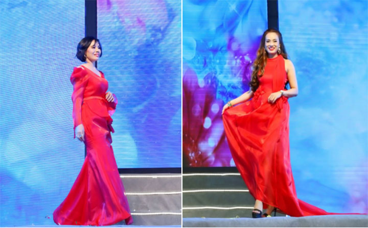 Doanh nhân Đỗ Thị Ái Phương - GĐKD CÔNG TY TNHH MTV MAY MẶC CAO KHÁNH LINH ( bên phải ) & Doanh nhân Lại Thị Thu GĐ CTY TNHH TM & DV TRẺ ĐẸP THÁI AN ( bên trái) đã thu hút mọi ánh nhìn trong chiếc đầm dạ tiệc màu đỏ- màu của đam mê và quyến rũ đến bất tận.